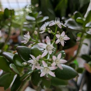 金のなる木 うっすらと🩷ピンクの可憐な花が咲きました。 根元には落ちた葉っぱから根を出しているものもあります。