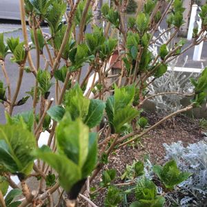 100pic応援有難うございました。🙇♀️ 一番大きなアジサイの青色が新芽を出してきました。🌱🌱🌱 この場所辺りに白いサルスベリが有りましたが カイガラムシが沢山付いてバッサリ切ったので 太い幹だけだったけどだいぶ明るくなりました。💕💕