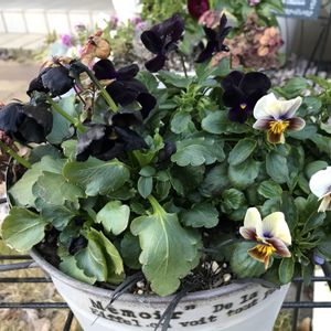 今年のビオラ寄せ植えです🤗 左 ブラックエミュー 奥 ハロウィンブラック 右 フロステッドチョコレート ブラックエミューさんは本当に深いブラックですね✨ 写真が下手でごめんなさい😅