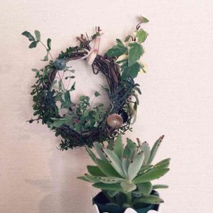 おはようございます💕 気が付けば100投稿❣️ 毎日皆さんのグリーンに癒されております。これからも宜しくお願いします✨ 今日は、三女が育てた朝顔のツルで作ってきたリースにお外のグリーンを足してコラボしてみました⭐︎