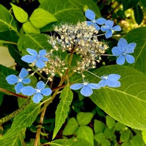 エゾアジサイ(蝦夷紫陽花) 別名 ムツアジサイ *アジサイ科アジサイ属 花期は6〜8月 主に日本海のやや薄暗い沢沿い等に生える。 淡い紫色の両性花とその周りに鮮やかな青色〜淡青色の装飾花(3〜5個)を付ける! よく似たヤマアジサイは 福島県以南に生え、少し小さく細身だそうです! そろそろ終盤でした! 7月5日撮影 秋保大滝植物園