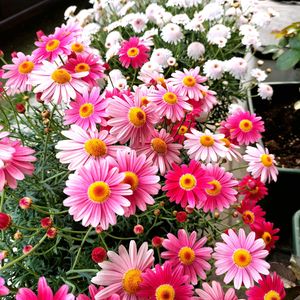 マーガレット🌼 今季はサントリーさんのボンザシリーズ 新しく小苗を昨年秋にお迎えしました🌱 空き部屋で育成なので色が淡いです そろそろ外に出してあげたい ➀イチゴショート🍰 ②↑アップにするとモコモコ ➂サンライズピンク🩷 ➃サンセットオレンジ🧡 ⑤お出かけ先、首里城の花壇のマーガレット😍