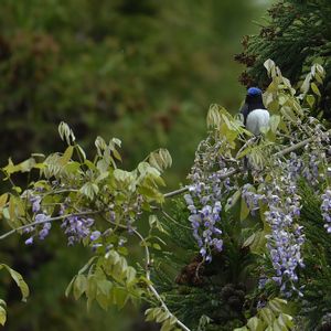 いつもの渓谷沿いの散歩道で初めて三鳴鳥のオオルリ🐦に遭遇。それも樹の上に留まることが多いオオルリが水辺のロープに留まっていたのにビックリ(@@)しかも3mくらいまで近づいたのに逃げず。早朝で薄暗かったこともありスマホ📳の望遠撮影📷ではこれが限界。多分水を飲みに来ていたのだろう。その帰り遅めのヤマフジが満開に。