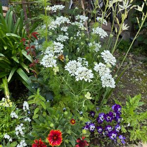 バラのアーチの左側 奥まった我が家の庭は花盛りでも人の目にあまり触れませんが、この場所は道路から見やすいので、道ゆく人に楽しんでもらいたい場所。 アーチ右側のモッコウバラが終わってしまったので今度はこちらの出番です。 零れ種のオルレア、オンファロデスの他に姫金魚草、ラークスパー、勿忘草、ニゲラ、ブラックレースフラワー、レモンベルガモットなんかも勝手に育ち中🤭 ガイラルディアは庭の子の挿し芽苗です。まだ咲いてないけど隣に黄色い子もいます。 もうすぐこの後ろに植えてあるスモークツリーも咲き出すので蕾がいっぱい💕 そして抜いても抜いてもあちこちで咲くオルレアはドライフラワーに(2枚目)。 とっても可愛く増殖中です🤍