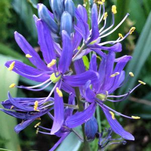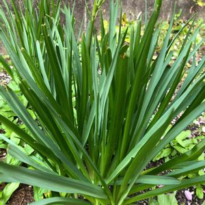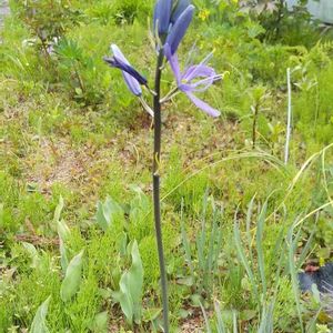 カマシア やっとわかりました‼️ 庭に、いつ植えたかわからない花です。 球根?細い葉が、茎を中心に土から放射状に出ています。
