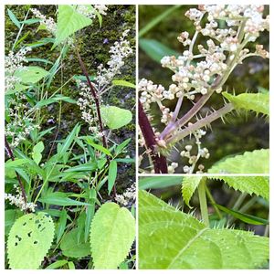 お初植物。同じ沢沿いにおりました、ムカゴはついてないけどムカゴイラクサかと思うんですが?ミヤマイラクサ? どちらも、🌱イラクサ科ムカゴイラクサ属 雌雄同株、葉の下に白く咲いてるのが雄花で、写真には写ってないけど、枝の先ピューピューと緑がかった雌花がのびている。 とうもろこしと逆だね😆 トゲだらけで凄く痛いけど、春の新芽はどちらも山菜になるのだそうです😳