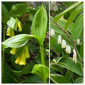 子供の頃から好きな花 左、キバナホウチャクソウ。 右、斑入りアマドコロ。 多年草毎年顔出してくれますよ^ ^ アマドコロは日本の野草、食材にも、民間薬としても利用されてきたんだって🌱 もったいなくてとても食べられません^ ^