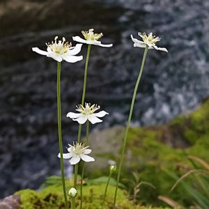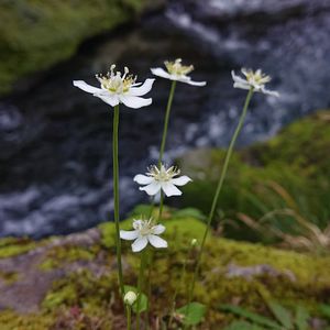 小梅鉢草 (コウメバチソウ) ニシキギ科 ウメバチソウの高山型変種で全体的に小型。 花茎の先端に梅に似た白い花を1個つける。 雄しべ5個、雌しべ1個、特徴のある仮雄しべは5個。芸術的な仮雄しべ。