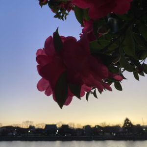 おはようございます 今日のお花『サザンカ』𓂃𓂂ꕤ*.゚ 朝焼けを背景に素敵なシルエットの山茶花•*¨*•.¸♬︎✧︎*。