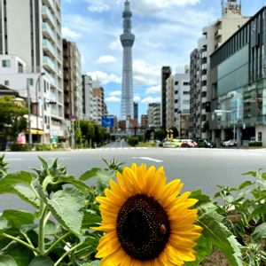 向日葵とスカイツリーです。向日葵が少し横を向いていますが…💧