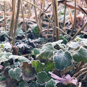今季初の氷 スイレン鉢に薄っすら張っていました そおっと持ち上げてみると 葉っぱと同じ形💙に開いていました☺