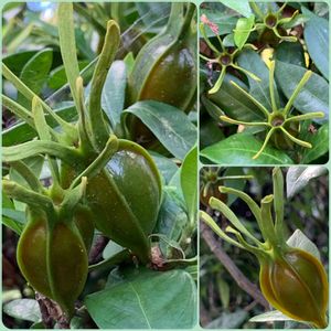 ❤️今日のお花の実❤️ クチナシ(梔子)シリーズ3弾 季節が秋めいてきて! 少し🤏心が弾みます💕😊 クチナシの花も散り、萼だけ 残り、季節が移り変わり萼の 下にはこの様な、実がなりました。 萼に支えられて咲いた白い花から すると?実の姿は、シッカリ実の 中の種子をガードしていますね、 逞しさを感じます💕 2021年9月29日 長徳禅寺にて撮影 しました😊oki