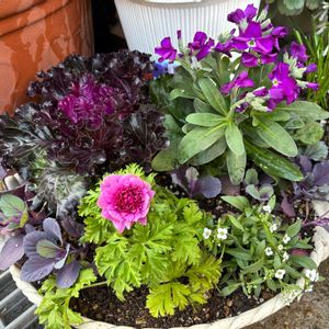 こんばんは♪ 植欲が抑えきれず、南海園さんに行ってきました。 ①お迎え品➕種から葉牡丹 ②パンジーか、ビオラか…迷って、よく咲くスミレをお迎え😅先日お迎えしたエリカちゃんとムスカリもいれてみました🤗お花が咲いたら、色の洪水になるかも🤣🤣🤣 ③お一人様でプリムラ🩷 ④いただきものの吉祥草。やっと花芽が😭