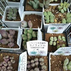 うちのコノフィツム バーンっ 確か秋になる前は、名無しバルタン、将門、アルバ、雛鳩の4つだったのに、あれよあれよと、、 来年はいっぱい咲いてくれるかなぁ 左 花園 1段め 雛鳩、将門、アルバ、名無しバルタン 2段目 青海波、聖園、群碧玉、鳩笛 3段目 富士の衣、水玉、ミスタム、王宮殿 4段目 ルイザエ、シネレオビリデス、ブランダム、白拍子 右1 水玉、歌姫、ピリフォルメ、初音 右2 クラベレンゼ、神鈴、典待、ウィルヘルミー