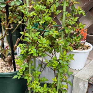見えにくくて申し訳ないのですが、これミニバラです。 コルダナシリーズとだけ書いてあったので詳細な品種は不明。 「ミニバラは、つる性じゃない品種の場合は、背丈を高く仕立てても枝が細くて水分や栄養を枝の先まで送れないからよした方がいい」…とのことだけど、樹勢が物凄いのでつる仕立てでもいけるのではないかと思い、冬剪定の際にこのように仕立てました。 さて、花付きはどうなるでしょうね。 楽しみです。