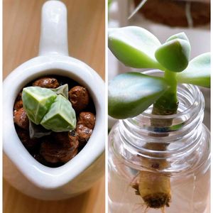 🌿調子が悪いコをどうにかしたい⤴︎ フォローさせて頂いてる方々から色々お話を聞かせてもらって挑戦中です☀️ ------------------------------------- 私のやり方があってるか不安ですが😂 左⇨レーマーニー錦は土の上に1ヶ月ほど置いてても無反応で発根せず、それどころか下のほうが黒く... 右⇨アワユキちゃんは発根はしてますが新芽も出ることなく止まったまま...下の大きな葉も変形して枯れちゃったり.... ここから、アドバイスを参考に経過を待ってみようと思います❣️