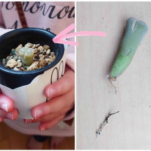 室内:リトープス 2022.10.16の投稿で植え付けた瀕死のリトさん🥲 少し大きくなってきたかな?と思って娘と見ていたら…ズボッと抜かれてしまい、、せっかく生えてきていた根が千切れました😭(右) 傷心の再スタート(左)以前よりは少し大きくなっていると思うので、溶けずに頑張ってもらいたい😵💫💦