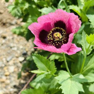 【アツミゲシ(渥美芥子、渥美罌粟)】 地中海沿岸原産、ケシ科一年草 麻薬成分を含んでいるので栽培が禁止されている植物であるが、時折路傍などに生育しているのがみられる。 愛知県渥美半島において日本への帰化が発見されたことに由来する。 茎は直立、よく分枝し、茎の先端に直径 6cm ほどの4弁花をつける。 花弁の基部には濃い赤紫の紋様がある。 草丈:30~70cm 花期:5~6月 花色:赤~濃紫色 公的機関の植え込みの中