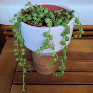 緑の鈴(グリーンネックレス)の手入れを娘がお手伝い✂️ "String of Pearl" の名でアメリカでも人気の多肉植物。和名が可愛い💚