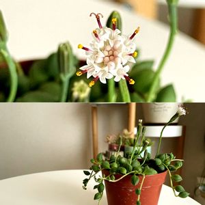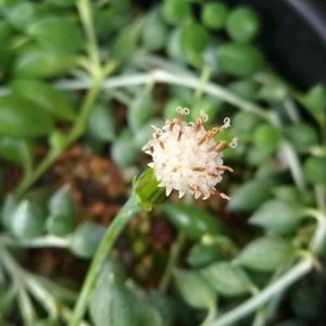 お迎えしていたセネシオ属の緑の鈴、グリーンネックレス。 豆みたいな葉っぱがいいですよねー^ ^ 室内で育てていたら、かわいい花が咲きました!!