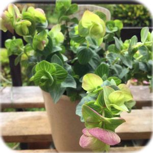 オレガノ ミルフィーユリーフ(向かって右)と ネオンライト(左)🌿 かわいい(* ॑꒳ ॑*)💓 ガクの色がライム、ピンク、緑色になったり ピンクのお花が咲いたり その変化が楽しい😊💕 間延びししたり枯れてきたら、 切り戻すと新芽がでてきます。 切ったオレガノはコップに生けたり ドライフラワーに❁⃘*.゚ また新芽から見ていくのも💚 DAISOの小さな入れ物に水切り穴を開けて寄せ植え。 増えてくるから、もう少し大きな物に植えても良かったなぁ💦