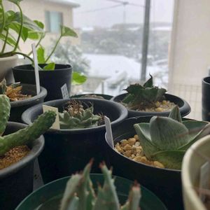 雪❄️振ってまふ(・Д・)ノ 2月23日出演のペチュニア。 風が当たらないよう避難させました。 こぼれ種からやっと5ミリくらいになった ちっさい芽🌱がある鉢は家の中に避難。 枯れないでおくれよー💦