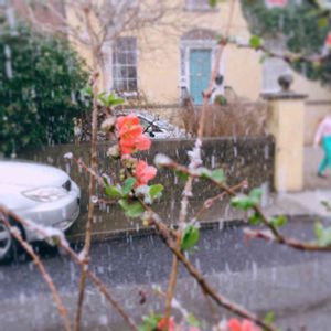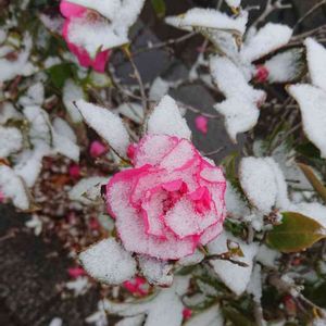 おはようございます☂️ 朝起きて、恐る恐るカーテンの外を見たら… 雨でした😆 積もったのは芝や土の上だけ。 良かったです😊 でも、寒い😵‼️ そんな中、椿(だったと思う😅)が凛と咲いています🌺 亡くなった旦那のおばぁちゃんが名前を教えてくれたのに忘れてしまいました😔 ピンクに白が混ざっていて、とてもカワイイです☺️