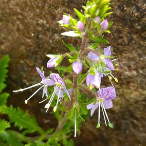 ミヤマクワガタ オオバコ科 高山帯の砂礫地に生える多年草。 高さ10cm程.花は径1cm程 長い雄蕊が2本花外に突き出す。 果実が兜の飾りのくわ形に似ることから付いた名前。 2021.5.19
