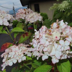 やっと我が家の紫陽花をお披露目できます といっても先日の暴風雨で折れた2枝 紫陽花 ホワイトレオン 挿し木で育てた2株 育てた場所でピンクとブルーになりました 親株は咲き始めたところです 数年前に園芸店で見かけて上品で優しいのにキリッとした花姿に一目惚れでのお迎えです 切り花にすると思いのほかシベが落ちる困ったちゃん 以下ネットからの引用 ホワイトレオンはアクアブルーに紫の縁取りが入るフリル咲きの人気品種レオンの白花タイプです。白色の花弁に紫色の縁取りがとても美しく、花色は夏以降に次第にグリーンに色付き、秋になると美しいグリーンに変化します。秋色アジサイとして長く楽しめます