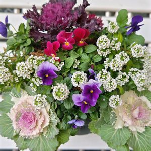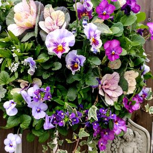 スリットバスケットを使って寄せ植えしてみました😃 今回はお安い苗を使ってあります ビオラもパンジーもシロタエギクも100円 葉牡丹はナラティブフラワーズさんのオリジナル