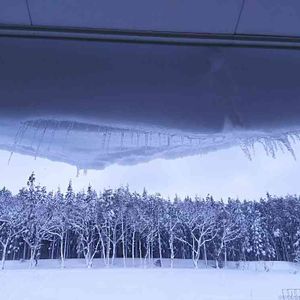 今にも落ちそうな屋根の雪❄ 気温が上がるといきなりドサッと 落ちます ヒヤヒヤ💦 (朝は加工なしでも青白く見えます)