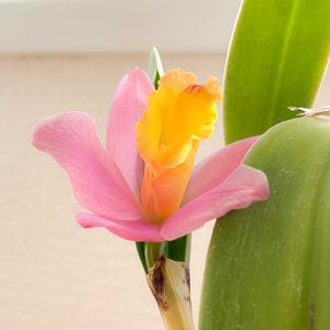 開花🌸Cattleya Crystelle Smith NR🌸 ①上下逆に咲いてきました🫨 ②なので上から撮影📷✨ ピンクと黄色でかわいいです🩷💛😍