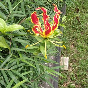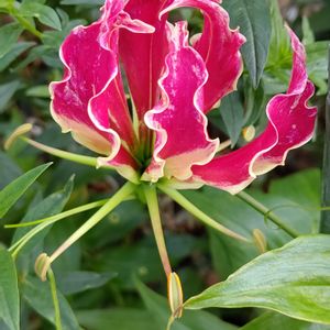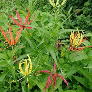 グロリサオ 和名アカバナキツネユリ 葉の先端に巻きヒゲが あり近くのお花に巻き付いて広げてゆくのが凄いです!