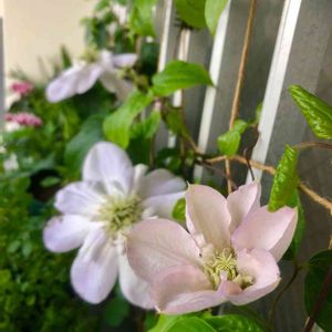 •クレマチス イノセントブラッシュ 新枝花が開花(手前)。 奥にある大きな2輪、藤色のセミダブル咲きが旧枝花で、先月開花した。もとは新枝花のようなピンクが花弁の外側に乗っていたのだけど日にちが経つにつれて藤色になった。 やるじゃん。 でもコレジャナイ感。