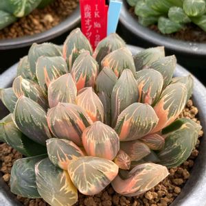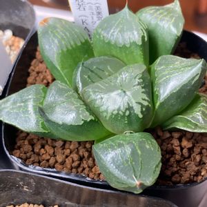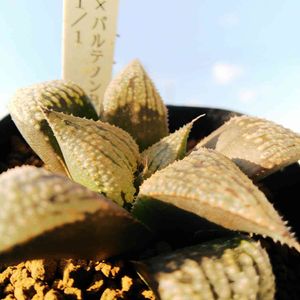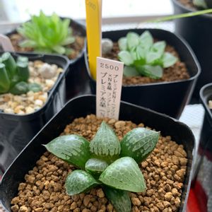 こんばんはヾ(๑╹◡╹)ノ" カクタスニシさん 初売り3株目 標本株の妖精シリーズが綺麗で 欲しかったけど 同じのはたぶん無かった中 妖精の交配株見つけたー とりあえずゲットですね。 今回1番好きかも ハオルチア 夢殿(ウィミー交配株)x パリダの妖精キング (ジャイアントパリダx森の妖精)