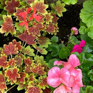 おはようございます😊 手前:PW さんのスーパーゼラニウムチャンピオン リラ 2021年のアンバサダー株 おく:カリオペダークレッド 写真だと上手く捉えられませんが、花びらがビロードみたいな光沢が有ります