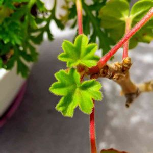 ゼラニウムの新しくでてきた葉っぱがもみじかちびっこの手にみえる。茎が赤くて力を感じる。