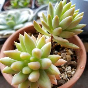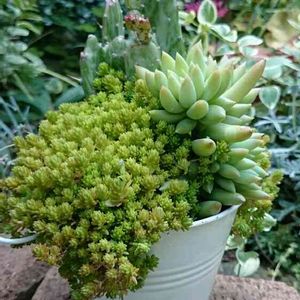 こんにちは♪ 暑いですね💥 今日は外出先から投稿😃 セディちゃんと、モルガちゃん 🍀がツンツンで可愛い😍 水不足なのかな😓 黄色く……😱😭 でも、たっぷり上げれないよね😓 😖💦 セディちゃんはお子が2個も!! 頑張って夏越えしてほしいよぉ😭 «セディフォルメ:セダム属» モルガニューム::セダム属»