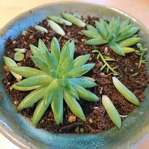 お友達にいただいた多肉さん。 ほかの方のお写真からセディフォルメなのかな? 1株グラグラしてたので、とりあえずカットして横にさしてみました(^_^;) あとは葉が落ちていたので葉挿し出来るのかな?