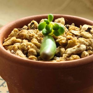 葉挿し虹の玉が1つだけ綴化っぽくなってた❗ 面白いので1寸素焼鉢で御一人様 【追記】 ベランダに置いた瞬間に倒してしまい親葉が取れた💦無事に育つだろうか(ToT)