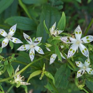 【アケボノソウ(曙草)】 日本・中国・ヒマラヤ原産、リンドウ科二年草 北海道から九州の湿地や沢沿い等、水気の多い場所に自生する。 1年目はロゼットで過ごし、2年目に1m近くまで茎を伸ばして直径1.5cm程の花を咲かせる。 白地で花先に胡麻状の紫斑、黄色い丸い模様が2個ずつある5弁花を付ける。 花弁の大きな点を日の出に、小さな点を星空に見立て、アケボノソウと名付けられた。 高さ:60~90cm 花期:9月~10月 花色:白色 山野草のエキ@周南市