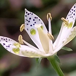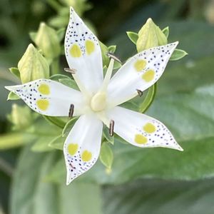 アケボノソウ 山寺から奥に続く横に川が流れている山道の縁にて出会う 白い水曜日♡🏷 裂片は5が基本だけれど、減がよくあって、 雄しべは裂だ片と同じ数になる🟣 今年は3裂発見▽ 3裂の画像では、葯が落ちて雌しべの柱頭がくるりとしており、雄性先熟の様子が分かる➰ 早くも若い果実が出来ているものもあって、緑色をした塔がそびえていた💚 2025秋の十草🏷