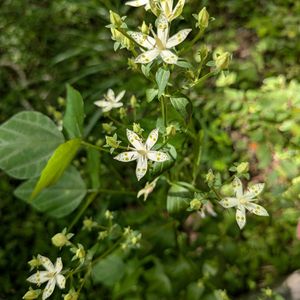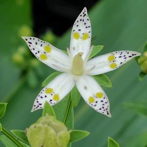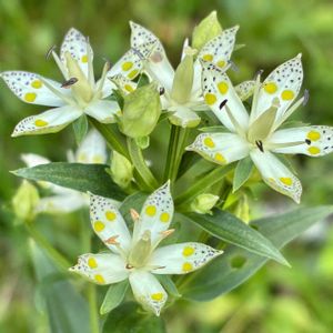 アケボノソウ リンドウ科センブリ属 二年草 北海道〜九州に分布 山地の池沼など湿気の多い場所に生える。 花冠にある斑点を夜明けの星空に見立てて、アケボノソウと名づけられた。 別名はキツネノササゲ。 草丈は直立して分枝し、最大で90cmになる。 花柄の先に星形をした径1.5〜2cmの白い小花を咲かせる。 筒形で、先端は深く5つに裂けるため5弁花のように見える。 花の各裂片には、アリが集まる蜜腺溝と呼ばれる黄緑色の腺が2つと 星空に見立てられる濃緑色の斑点が多数ある。 花期9〜10月 🏷️金曜日の蕾たち に参加させていただきます。