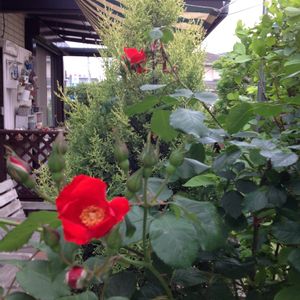 娘一家と遊んだあと👶つるバラたちに、花ごころさんの油粕80gを施肥し、枝の整理・誘引をしていて日が暮れました。