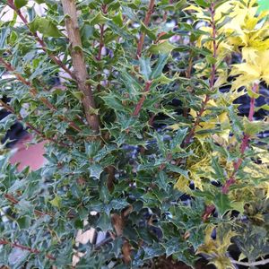 黄緑色の新芽の葉っぱにギザギザがありません😅 古株になると時々トゲのない葉っぱが出ますね❣️ 2枚目は友人の田舎のヒイラギの花 3枚目は我が家の斑入りヒイラギの盆栽のお花