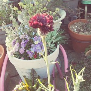 セントーレア ブラックボール 小さな苗1苗が大きく育ってチョコレート色の八重咲きの花を咲かせています 背丈は1メートル近くあるかな シックで大人の雰囲気✨✨✨