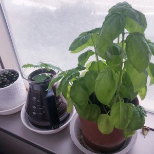 〜事務所の片隅で〜 右から、バジル、レモンバーム、ワイルドストロベリー レモンバームは欠けてしまったコーヒーサーバーを再利用