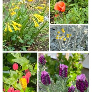 ご近所さんの空き家のお庭に(-_-) キルタンサス🌼 ナガミヒナゲシケ💠 シロタエギクが咲いています❣️ 垣根に咲いて、てんとう虫🐞がとまっているのはなんだったけ⁇ アプチロン(チロリアンランプ) みーさんに教えて頂きました🤗 お隣のアパート入り口のフレンチラベンダーもご一緒に🥰