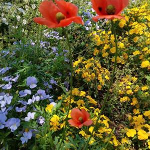 こんにちは😃 私の徘徊路❣️ 駅が近いのにこの辺りは沢山🌼🌿 人に会う事もないお気に入りです🎶💖 新宿行きの急行電車🚃も人影はないようです(*´-`) キツネアザミ💖 ナガミヒナゲシ💖 分からいけど可愛い⁇💕 教えて下さいませ🤲 タチジャコウソウ シソ科 タイム🌿 M y植物図鑑さんに教えて頂きました🤲🥰