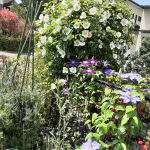 クレマチス・テッセン フェンス一面に咲くのが楽しみ~~😍🥰 その下で 可愛くチリアヤメが咲いてます💜